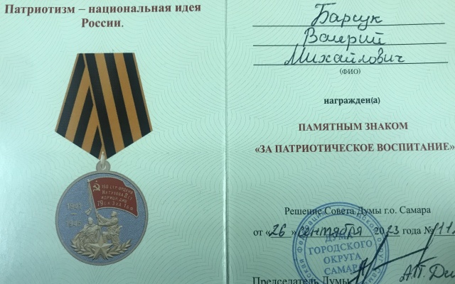 Депутат Думы городского круга Самара, председатель Совета регионального отделения партии "РОДИНА" в Самарской области Валерий Барсук был отмечен почетным знаком самарской Думы "За патриотическое воспитание".